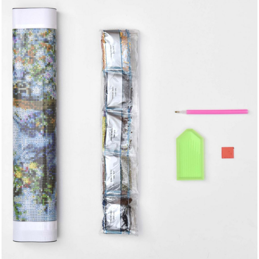 – Zestaw odpowiednich kolorystycznie diamencików dla danego wzoru (każdy kolor jest zapakowany w osobny woreczek). Woreczki z diamentami są opisane zgodnie z legendą na płótnie.,