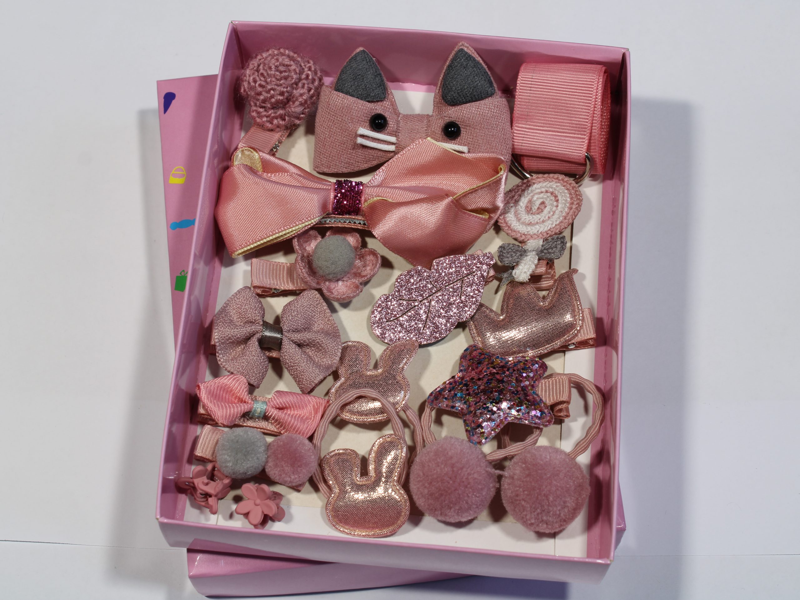 Kompletny Zestaw: Zestaw zawiera 13 spinek, 4 gumki, tasiemkę do przypinania spinek (zawsze będą w jednym miejscu) oraz eleganckie pudełeczko. To kompletny zestaw, który zaspokoi różnorodne potrzeby stylizacyjne małej modnisi.